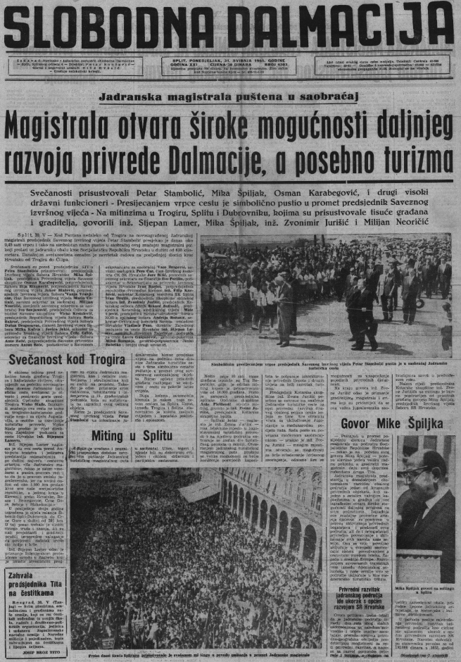 “Izgradnja ove značajne prometne arterije djelovat će pozitivno u pravcu aktiviranja privrednih bogatstava i prednosti ovog područja, ali će i omogućavati privredno povezivanje i zbližavanje svih naroda naše zemlje. Ona se vrlo povoljno uključuje u evropski saobraćajni sistem povezivanjem s cestovnom mrežom Istoka, Zapada i srednje Evrope. Razvijanjem suvremenih trajektnih veza između Apeninskog poluotoka i naše zemlje ovo se područje uključuje u šire mediteransko turističko područje”, kazao je prilikom otvorenja Mika Špiljak, tadašnji predsjednik Izvršnog vijeća Sabora SR Hrvatske.