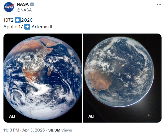 Usporedne fotografije Zemlje snimljene u sklopu misija Apollo 17 i Artemis II na društvenim mrežama dijele se kao navodni dokaz vidljive degradacije planeta. Razlike u boji oceana, oblaka i kopna tumače se kao posljedica klimatskih promjena. Mada su klimatske promjene neminovno degradirale naš planet, u ovom slučaju riječ je o tehnologiji snimanja, kutu osvjetljenja i atmosferskim uvjetima.